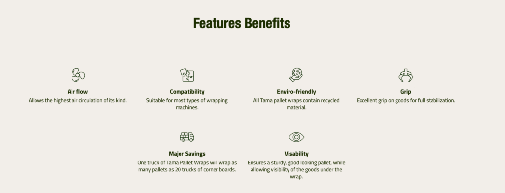 Designed for superior airflow, Tama Netfilm allows excellent ventilation even when layers are overlapped—helping to keep products fresher during storage and transit. It delivers outstanding grip to stabilise loads and prevent shifting, while maintaining a clean, professional appearance on the pallet. Its wide compatibility with all pallet wrapping machines ensures reliable performance and ease of use across various operations. Most importantly, Tama Netfilm is engineered with environmental responsibility in mind—using less plastic to reduce waste without compromising strength or performance.